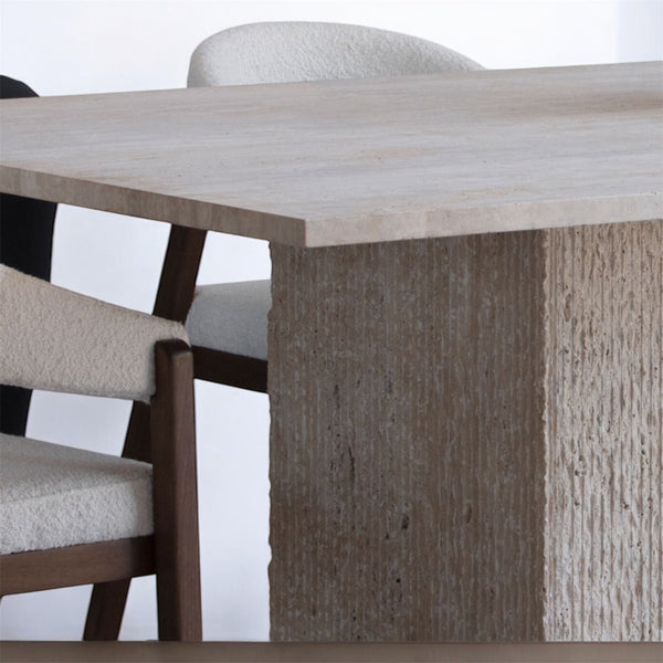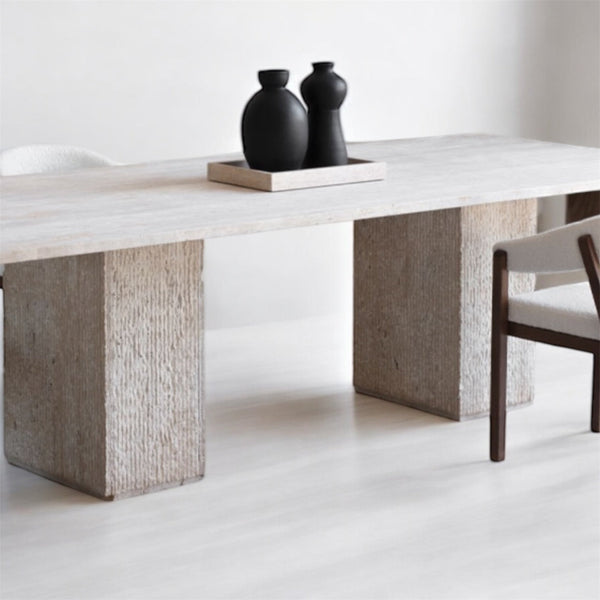 Notre table Ovelia en travertin naturel . Celle-ci sera parfaitement meublé avec sobriété et élégance votre salle à manger .