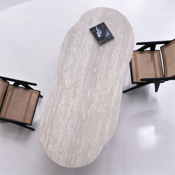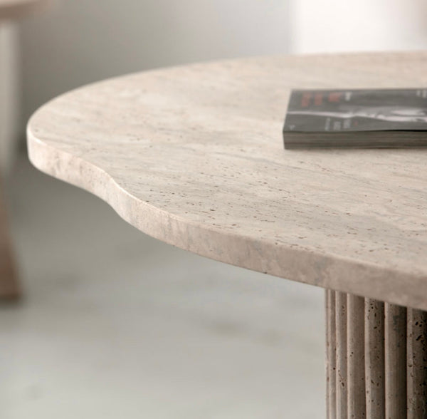 Notre table POLINE en travertin asymétrique naturel Celle-ci sera parfaitement meublé avec sobriété et élégance votre salle à manger .