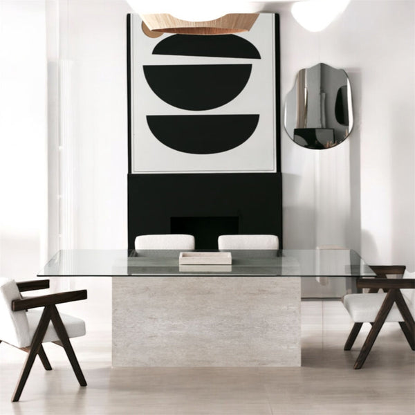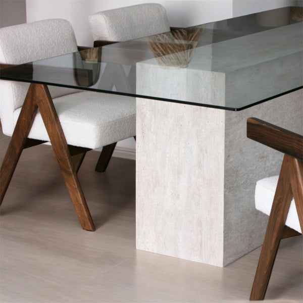 Notre table Emile en travertin naturel se différencie avec son pied central et son plateau en verre. Celle-ci sera parfaitement meublé avec élégance et modernité votre salle à manger .